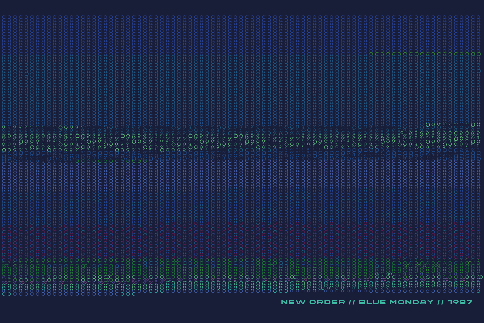 Each pattern is generated from MIDI file data after conversion to CSV (comma-separated values), so it displayed in a different form than traditional sheet music. Starting from the top all the parts for track 1, then 2, 3, etc. I took 5 genres: Rock/New Wave; Rap/Trap; Progressive Metal/Rock; Modern Pop; Classical, 2 songs in each genre, then I assigned colour palettes to different ranges. In general there are 11 possible ranges, from 1 to 10 contains 12 numbers which are 12 notes of an octave: C, C#, D, D#, E, F, F#, G, G#, A, A#, B. However, 11th range has 6 note shorter than other 10 ranges. During my experimentations I did not discover any song which would go extremely low or high, so the colours for these ranges did not make it to final patterns.
